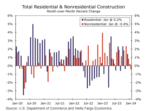1월 건설지출은 전월보다 0.2% 감소한 것으로 집계됐습니다. 월가는 0.3% 증가를 예상했죠. 건설지출이 줄어든 것은 2022년 12월 이후 13개월 만입니다. 다만 12월 수치는 0.9% 증가에서 1.1% 증가로 상향 수정됐습니다. 웰스파고는 "이번 하락은 부분적으로 1월 미국 전역이 겪은 혹독한 겨울 날씨로 인한 것으로 보인다"라면서도 "주거용 건설지출(0.2% 증가)은 이어지고 있지만, 비주거용은 1월 0.4% 감소하는 등 최근 몇 달 동안 둔화하고 있다. 불확실한 수요 전망, 상승하는 이자율 및 신용 접근성 감소와 함께 앞으로 몇 달 추가 감소해도 놀라운 일은 아니다"라고 분석했습니다.