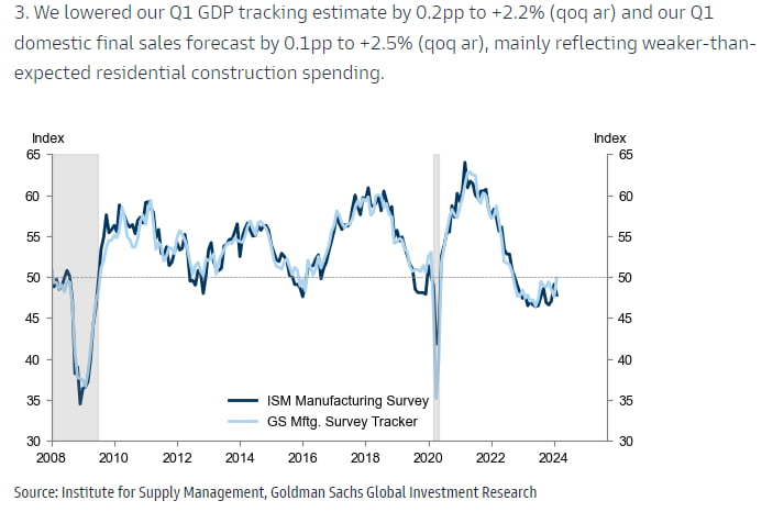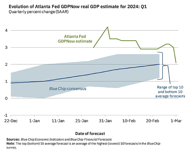 이런 데이터가 발표된 뒤 골드만삭스는 1분기 GDP 추정치를 기존 연율 2.4%에서 2.2%로 낮췄습니다. 애틀랜타 연방은행의 GDP나우도 1분기 추정치를 기존 3.0%에서 2.1%로 크게 떨어뜨렸고요.