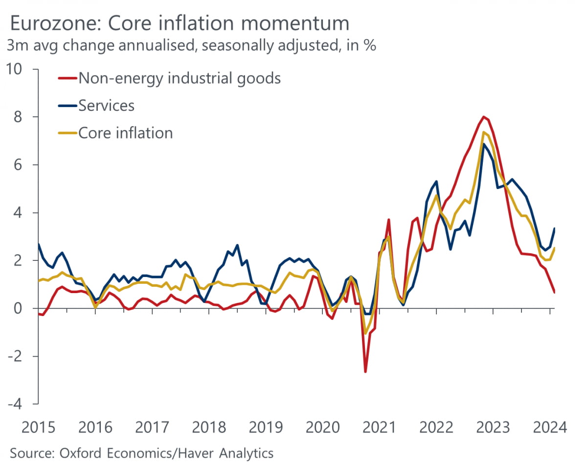 유럽의 물가는 예상보다 강하게 나오면서 인플레이션이 쉽게 꺾이지 않는다는 걸 다시 한번 깨닫게 해줬습니다. 유로존 2월 소비자물가(CPI)는 1년 전보다 2.6% 상승한 것으로 나타나 1월(2.8%)보다는 개선됐지만, 시장 예상치 2.5%보다 높았습니다. 에너지와 음식물을 제외한 근원물가 상승 폭도 3.1%를 기록해 역시 1월(3.3%)에 비해선 둔화했지만, 예상(2.9%)보다는 덜 완화했습니다. 미국 인플레이션과 비슷한 모습을 보인 것이죠. 골드만삭스는 그동안 유럽중앙은행(ECB)이 4월에 금리 인하를 시작할 것으로 예상했지만, 이를 6월로 미뤘습니다. 시장은 4월 6bp의 금리 인하, 6월 24bp의 금리 인하로 가격을 매겼습니다. 이로 인해 유럽의 금리가 상승하면서 뉴욕 채권시장에서도 아침에는 금리가 상승세를 보였습니다.