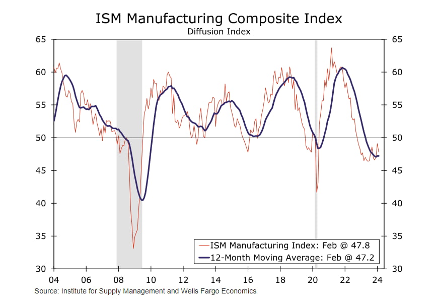 ISM이 발표한 2월 제조업 PMI는 1월 49.1보다 1.3포인트 하락한 47.8로 나타났습니다. 월가는 49.5로 올라갈 것으로 봤지만 오히려 큰 폭 하락한 것이죠. 세부 내용도 좋지 않았습니다. 신규 수주 지수는 49.2를 기록해 1월의 52.5보다 3.3포인트나 후퇴하면서 위축 국면(50 미만)으로 떨어졌습니다. 고용, 생산 등도 모두 하락했고요. 지불물가는 52.5로 직전 달의 52.9에서 둔화했지만, 여전히 오름세(50 이상)를 보이는 것으로 나타났습니다.