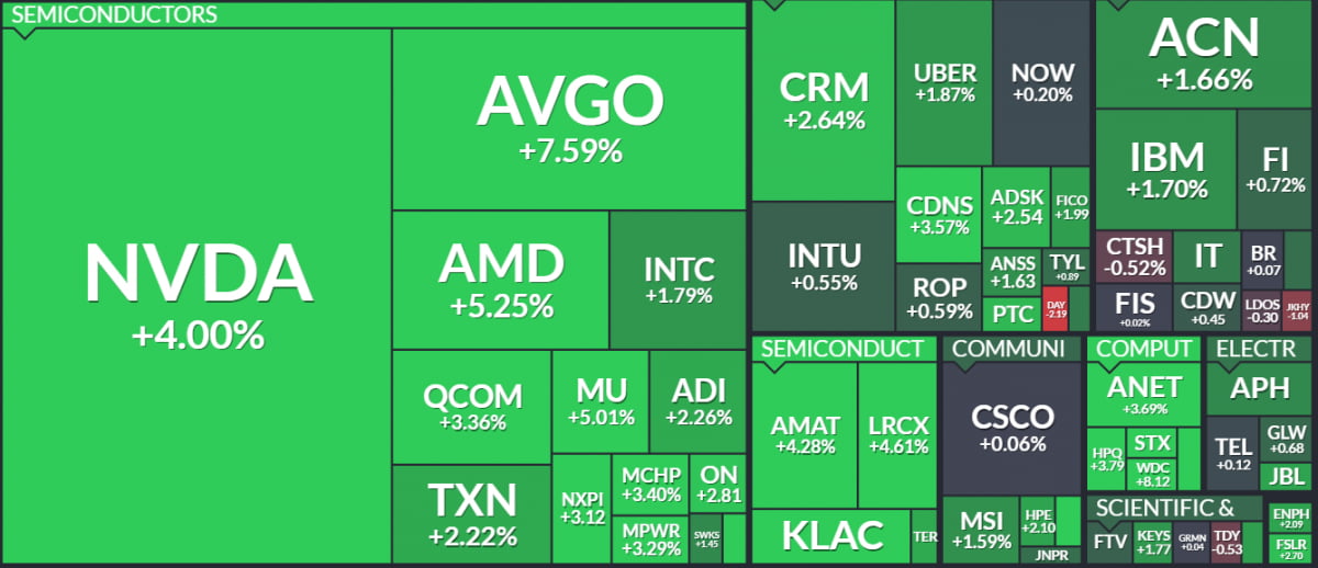 이유는 AI로 인해 반도체 수요가 넘치고 있다는 사실을 투자자들이 곳곳에서 확인할 수 있었기 때문입니다. 지난 수요일 저녁 스노우플레이크는 향후 실적 부진을 경고하면서 "새로운 AI 칩에 대한 수요가 매출 성장에 압력을 가하는 요인 중 하나"라고 밝혔습니다. 어제 장 마감 뒤 델은 실적 발표를 통해 “엔비디아와 AMD의 차세대 AI 그래픽처리장치(GPU)를 탑재한 서버에 관심이 많고 관련 수주도 늘고 있다”라고 밝혔습니다. 함께 실적을 내놓은 휴렛팩커드(HP)도 “고성능 서버 공급에 필요한 엔비디아의 GPU 칩을 제대로 공급받지 못하고 있다”라며 빡빡한 AI 칩 수급 상황을 전했지요. 씨티그룹은 반도체 보고서에서 "사실상 모든 기업이 AI 칩을 구매하고 있어 반도체업종을 매우 낙관적으로 보고 있다”라고 밝혔습니다.