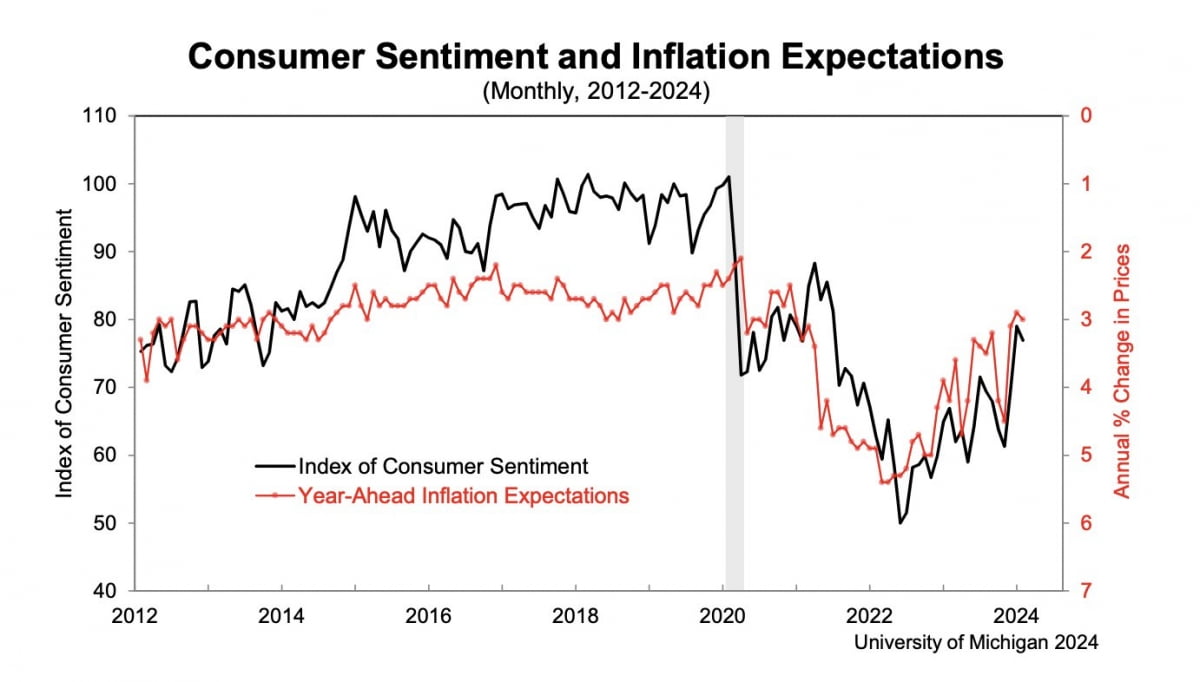 미시간대의 2월 소비자심리지수(최종치)는 예비치 79.6에서 76.9로 2.1포인트나 떨어진 것으로 발표됐습니다. 1월 79.0보다도 낮고요. 한 달 동안 두 번에 걸쳐 발표하는 이 지수는 통상 예비치와 최종치가 그리 차이가 크지 않은데 이번에는 크게 나온 것이죠. 다만 2월 수치는 2021년 7월 이후 두 번째로 높은 수준입니다. 미시간대는 "이번 달 지수는 전월보다 소폭 하락하며 횡보세를 보였다. 다만 지난 3개월간 유지된 강세 심리는 유지되고 있는 모습"이라고 설명했습니다. 단기(1년) 기대 인플레이션은 3.0%로 전월 치보다 0.1%포인트 올랐고, 장기(5년) 기대 인플레이션은 2.9%로 전월과 같았습니다. 다만 지난달 27일 발표된 콘퍼런스보드의 2월 소비자신뢰지수도 106.7로 1월 110.9보다 낮아지는 등 소비자 자신감의 회복세가 흔들리고 있다는 게 나타나고 있습니다.