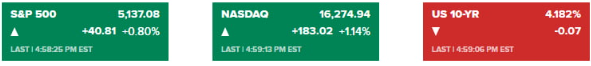 금융시장 분위기가 좋은 건 아니었지만 증시는 시간이 갈수록 상승세가 가속했습니다. 결국, 나스닥은 1.14% 뛰었고 S&P500 지수는 0.80% 올랐습니다. 둘 다 사상 최고 기록이고요. S&P500 지수의 종가는 5137.08로 사상 처음 5100을 돌파했습니다. 다우는 0.23% 상승했습니다.