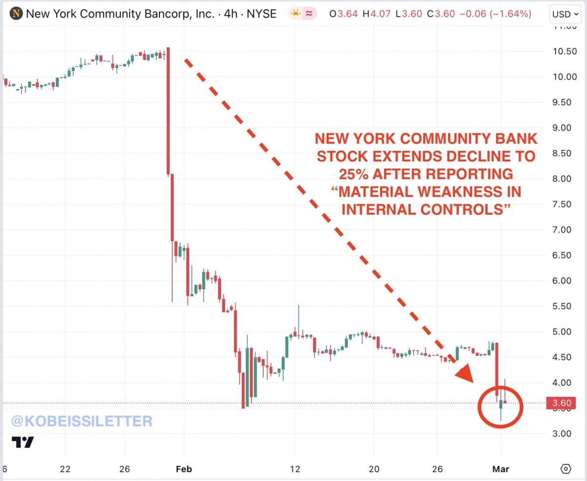 뉴욕커뮤니티은행(NYCB)은 전날 장 마감 뒤 실적보고서 정정 공시를 통해 대출 관련 내부통제에 '중대한 취약점'이 있었다고 밝힌 뒤 시간 외 거래에서 최대 30% 급락세를 나타냈습니다. 결국 오늘 25.89% 하락한 채 거래를 마쳤습니다. NYCB는 경영진도 또다시 교체했습니다.