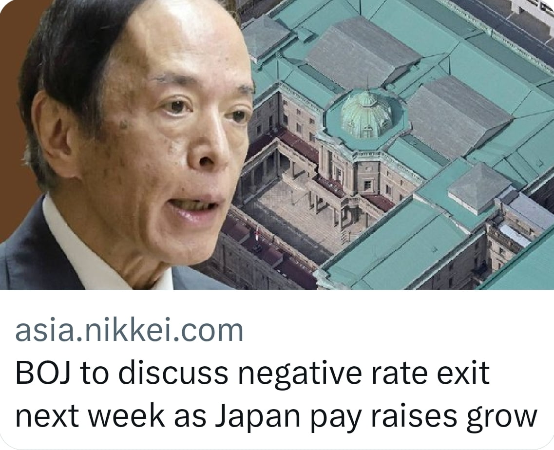 일본은행이 다음주 19일 마이너스 금리를 폐기할 가능성이 높아진 것도 금리 상승 요인입니다. 도요타 일본제철 미쓰비시중공업 등 일본 주요 기업이 올해 임금을 전폭 인상하기로 했다는 소식이 전해지면서 일본의 기준금리 인상 가능성이 커진 것이죠. “정책 변화를 위해선 임금과 물가 상승의 선순환이 필요하다”라고 강조해온 우에다 가즈오 일본은행 총재는 참의원에서 “교섭 결과 등을 종합적으로 살펴보고 적절한 결정을 내리겠다”라고 말했습니다. 닛케이는 "일본은행은 다음주 마이너스 금리 종료 여부를 논의할 예정이다. 주요 기업의 임금 인상으로 물가안정 목표 2% 달성이 가까워졌기 때문"이라고 보도했습니다. 재무성 관계자는 닛케이 인터뷰에서 “이미 임금과 물가의 선순환 여부를 판단할 수 있는 단계에 이르렀기 때문에 4월 회의를 한 달씩 기다릴 이유가 없다”라고 말했습니다. 일본은행은 2016년 2월부터 마이너스 금리(-0.1%)를 유지해왔습니다.