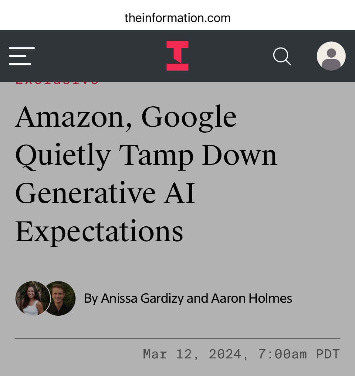 월가에서 오늘 회자한 기사가 있습니다. IT 매체인 인포메이션이 클라우드 서비스 업체 아마존, 마이크로소프트, 구글이 조용히 생성 AI에 대한 기대를 낮추고 있다고 보도한 것이죠. 아마존 등이 실제 고객에 과금할 수 있는 것보다 AI가 과장 광고되고 있다는 것입니다. 인포메이션은 클라우드 업계 경영진과 프로덕트 매니저(PM), 영업사원 등을 인용해 "고객들이 AI 소프트웨어 실행에 드는 높은 비용, 정확성에서의 단점, 이를 통해 얻을 수 있는 가치를 판단하기가 어렵다는 점 때문에 새로운 AI 서비스에 대한 지출을 늘리는 데 조심스럽거나 심사숙고하고 있다"라고 썼습니다. 이 기사가 AI 붐에 부정적 영향을 줬을 수 있습니다.