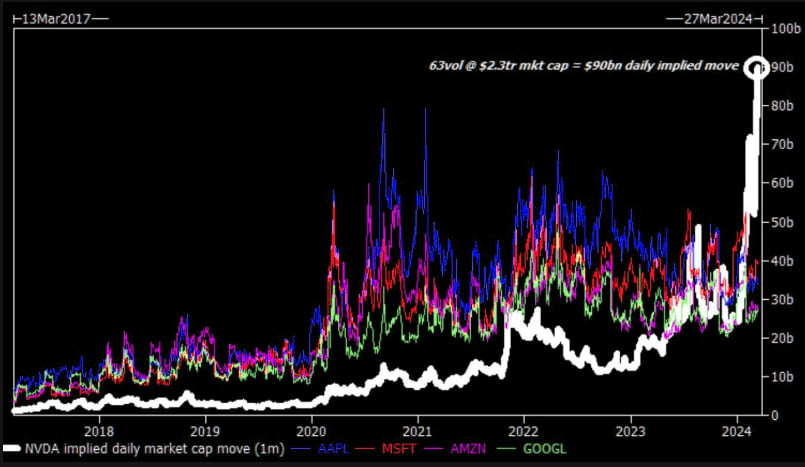 엔비디아의 주가는 지난 사흘간 841~974달러를 오가는 커다란 변동성을 보였습니다. 이는 엄청난 옵션 거래량 때문일 수 있습니다. 골드만삭스에 따르면 엔비디아는 거래된 옵션의 명목 가치가 3개월 평균 975억 달러로 단연 1위입니다. 시가총액의 4.2%에 해당합니다. 골드만삭스는 "S&P500 주식의 1개월 옵션 내재 변동성이 60보다 큰 경우는 매우 드물다(지금 현재 딱 하나뿐이다). 이런 내재 변동성은 주가가 하루 4%, 시총 900억 달러가 움직일 수 있다는 뜻이다. 과거 이런 걸 본 적이 없다. 옵션의 폭발적 증가로 인해 딜러가 기계적으로 헤지해야 하는 복잡한 위험이 발생했다는 사실을 잊지 말라. 강세 역학은 빠르게 약세 역학으로 바뀔 수 있다"라고 경고했습니다.