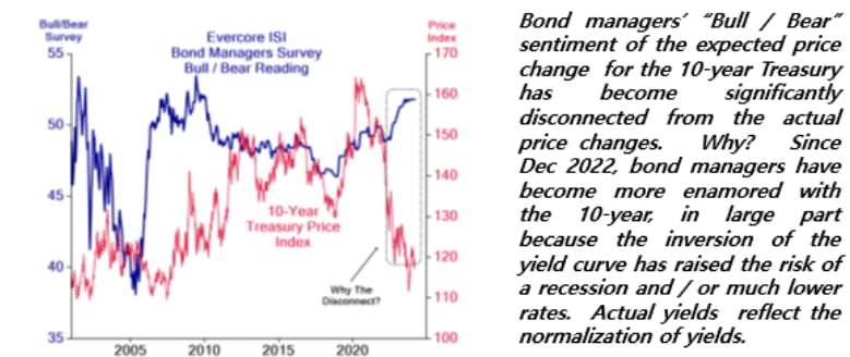 ⑴ 채권 매니저들은 10년물 국채 수익률 하락을 낙관하고 있다. 경기 침체 두려움은 줄어들었다. 하지만 인플레이션이 낮아지면 수익률이 떨어지고 경제가 계속 성장할 것이라고 믿는다.