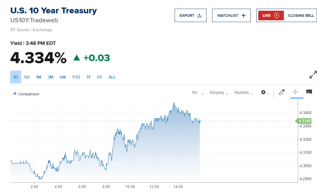 시장 금리도 계속 올라가고 있습니다. 뉴욕 채권 시장에서 오후 3시 50분께 미 국채 10년물 수익률은 3bp 오른 4.324%에 거래되어 올해 최고치 수준까지 상승했고, 2년물은 1.3bp 오른 4.736%를 기록했습니다.