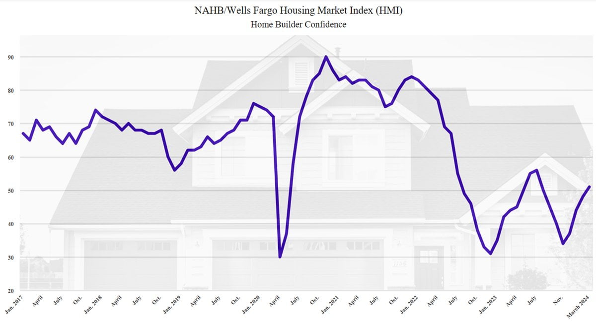 오늘 경제 데이터도 강했습니다. 미주택건설업협회(NAHB)의 3월 주택 시장 지수는 전월 48에서 51로 급등해 2023년 7월 이후 최고 수준을 기록했습니다.