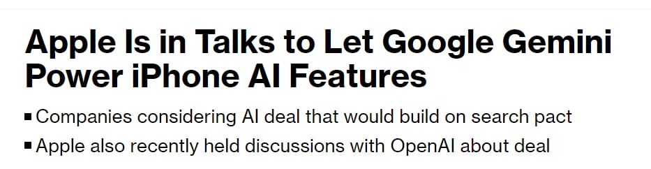 3대 빅 이벤트를 앞둔 18일 새벽, 하나의 빅 뉴스가 월가를 뒤흔들었습니다. 블룸버그가 "애플이 구글과 AI 모델 제미나이 엔진을 아이폰에 탑재하기 위해 논의하고 있다"라고 보도한 것입니다. 소식통을 인용해 애플이 곧 출시할 iOS 18에 AI 기능을 강화하기 위해 파트너를 찾고 있다는 것이죠. 그러면서 구글과 라이선스 계약을 논의 중이라며, 오픈AI와도 협의하고 있다고 썼습니다.