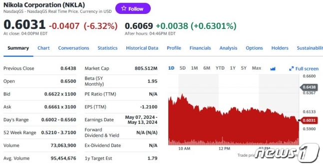 이에 비해 니콜라는 6.32% 급락한 60센트를 기록했다.