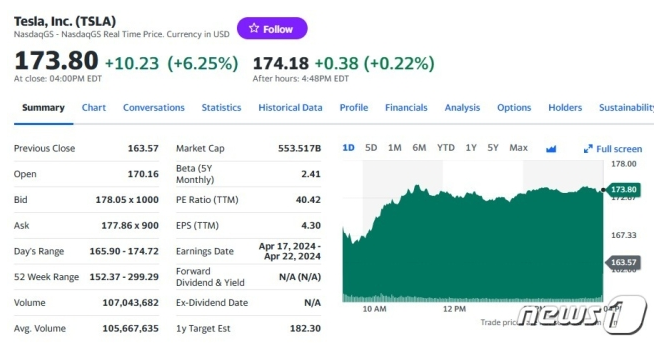 테슬라는 이날 뉴욕증시에서 전거래일보다 6.25% 급등한 173.80달러를 기록했다.