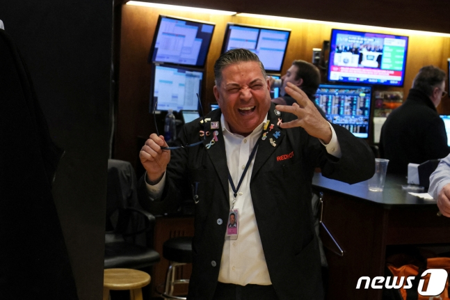 뉴욕증권거래소에서 20일 마감벨이 울린 후 한 트레이더가 환호하는 것처럼 보인다. 2024. 3.20 ⓒ 로이터=뉴스1