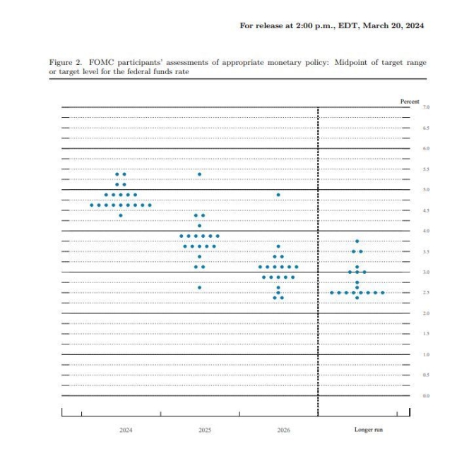더 주목받았던 점도표(금리전망표)에서 올해 금리인하 횟수는 기존 3번으로 유지됐다. 19명 연준 위원 중에서 10명이 올해 금리가 0.75%포인트(p), 3차례 인하될 것으로 예상했다. 이번 결정에 앞서 시장에서는 예상보다 높은 인플레이션으로 연준이 올해 금리를 3번이 아니라 2번만 내릴 위험이 있다고 봤었다.