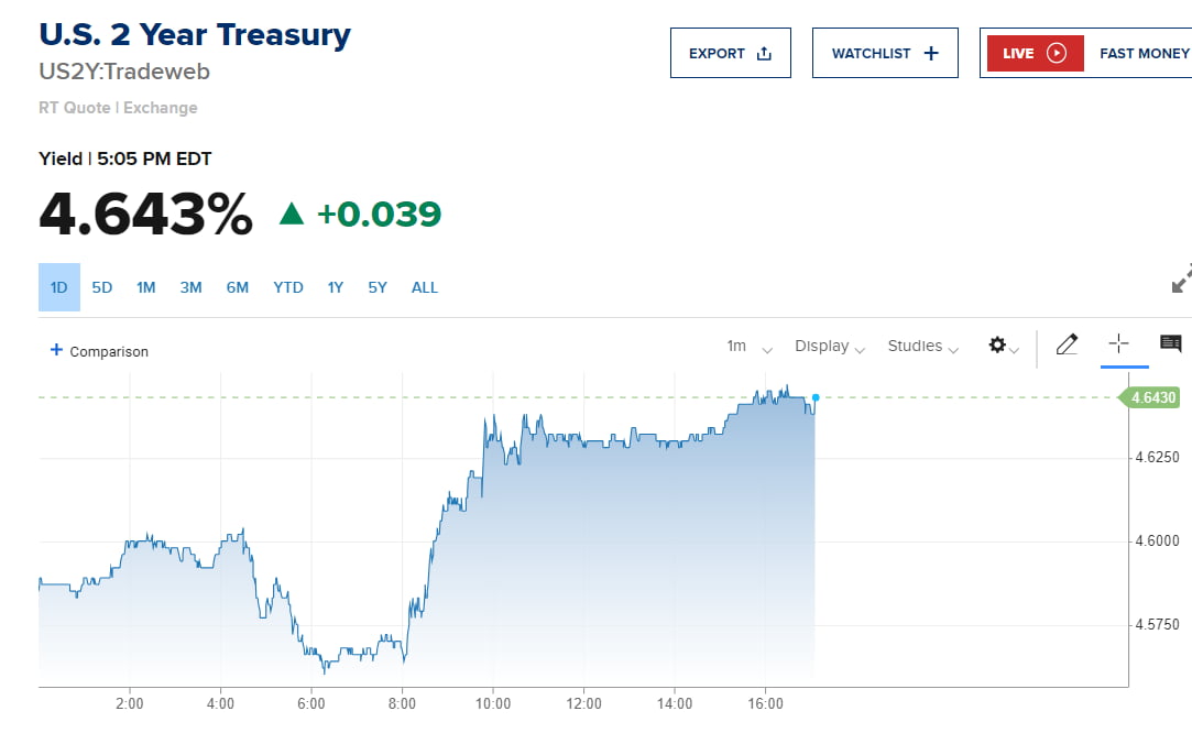 이런 강력한 데이터는 걱정이 많은 채권 시장에 영향을 줬습니다. 집값이 오르고 PMI에서 지불가격이 높게 나온 게 아무래도 부정적 영향을 미쳤습니다. FOMC 영향으로 국채 수익률은 새벽에는 하락세를 보였지만 아침에 데이터가 쏟아져 나온 뒤 오름세로 전환했습니다. 오후 5시께 2년물 금리는 3.9bp 오른 4.643%, 10년물은 0.2bp 내린 4.269%를 기록했습니다.