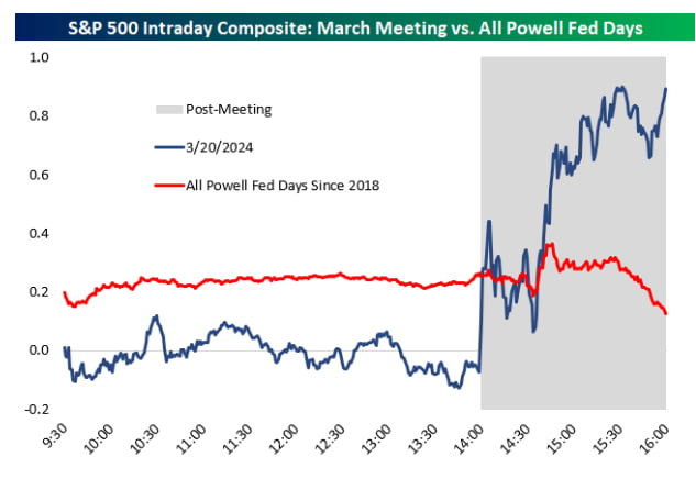 베스포크 인베스트먼트에 따르면 파월 의장은 2018년 취임 이후 48회 이상 FOMC 회의를 주재했습니다. 평균적으로는 그가 기자회견을 할 때 주가는 하락했습니다. 그러나 어제는 급등했죠. 베스포크는 "Fed가 완화적으로 바뀐 작년 11월부터 따지면 네 번의 FOMC 가운데 세 번 상승했다"라고 설명했습니다.