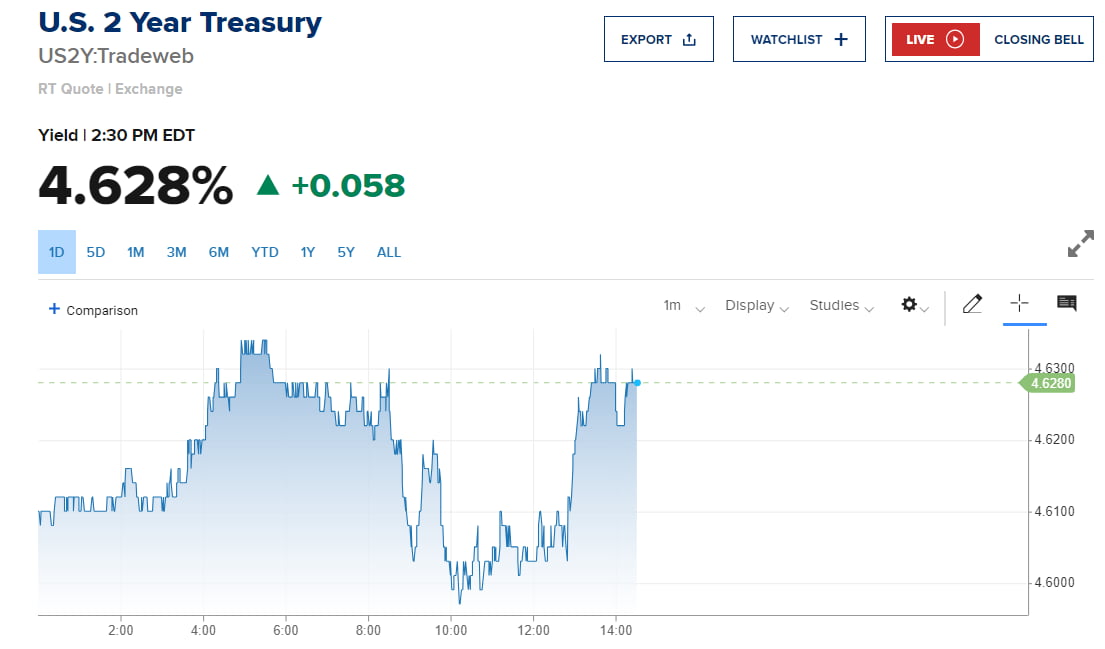 채권 금리는 즉각 데이터에 반응했습니다. 2년물 금리는 상승 폭을 대폭 줄였고 10년물은 마이너스로 돌아섰습니다. 다만 장 막판 상승세가 되살아났습니다. 뚜렷한 이유는 없었습니다. 오후 2시 30분에 2년물은 5.8bp 오른 4.628%, 10년물은 1bp 오른 4.206%에 거래됐습니다.