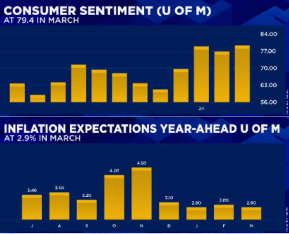 미시간대 3월 소비자심리지수(확정치)는 79.4로 2021년 7월 이후 약 2년 반 만에 가장 높은 수준으로 발표됐습니다. 2월 76.9, 앞서 발표된 3월 예비치 76.5에 비해 크게 뛴 것이죠. 그러면서도 장단기 기대 인플레이션은 모두 하락했습니다. 단기(1년) 기대치는 2.9%, 장기(5년) 기대치는 2.8%로 각각 2월의 3.0%, 2.9%보다 0.1%포인트씩 떨어진 것입니다. 미시간대는 "소비자들은 인플레이션이 계속 완화할 것이라는 확신을 나타냈다. 높은 물가와 소비가 생활에 미치는 부정적 영향이 줄면서 개인 재정에 대한 기대와 평가는 소폭 개선됐다"라고 분석했습니다.