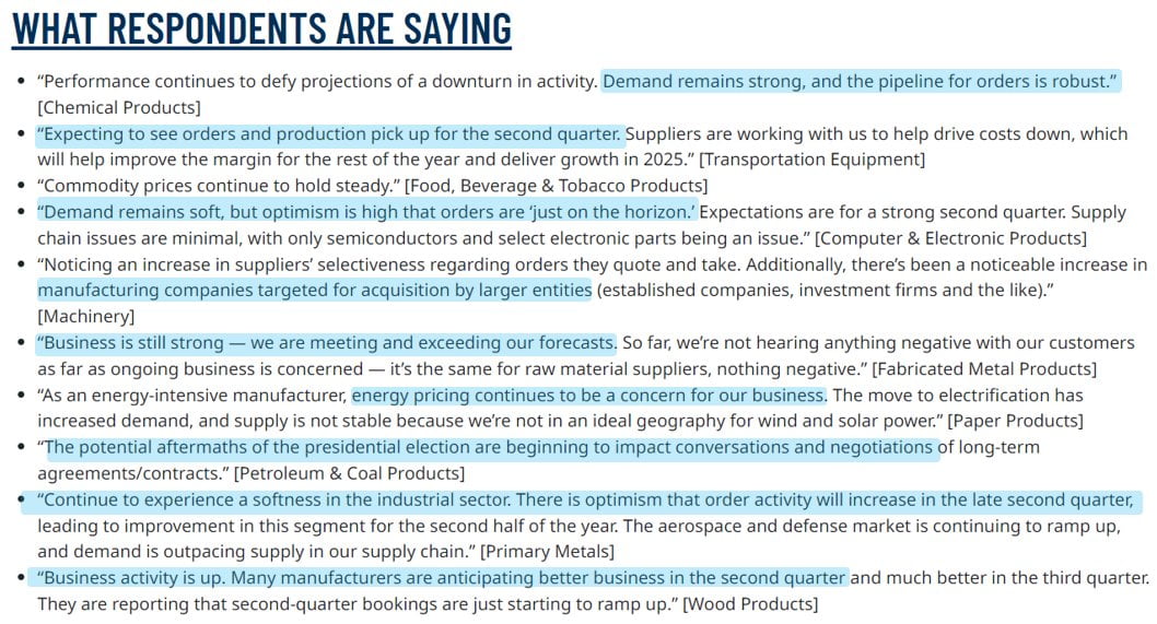 응답 기업 반응도 한결같이 긍정적이었습니다. ▲"수요는 여전히 강하고 주문 파이프라인도 탄탄하다”(화학 제품) ▲"2분기에는 주문과 생산이 회복될 것으로 기대한다" (교통장비) ▲“수요는 여전히 부진하지만, 주문이 곧 이뤄질 것이라는 낙관론이 높다. 2분기 실적이 기대된다"(컴퓨터 및 전자제품) ▲"사업은 여전히 탄탄하다. 우리 예측을 충족하거나 넘고 있다”(금속) ▲많은 제조업체가 2분기 더 나은 성과를 기대하고 있으며, 3분기엔 훨씬 더 좋은 성과를 예상한다"(목재제품) 등이 대표적입니다.