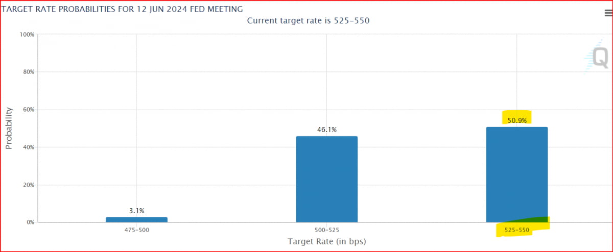 데이터가 발표된 뒤 뉴욕 채권 시장의 금리는 7bp가량 추가 상승했습니다. 국채 10년물 수익률은 한때 4.4%를 다시 넘기도 했습니다. 또 시카고상품거래소 Fed워치 시장에서의 6월 기준금리 인하 확률은 어제 66% 수준에서 54%까지 떨어졌습니다. 아무래도 고용이 예상보다 너무 강했던 탓이겠죠. 월스트리트저널은 "미국 경제는 빠르게 일자리를 늘렸지만 큰 인플레이션을 일으키진 않았다. 그건 6월 금리 인하에 대한 희망을 유지시켰지만, 간신히 그랬다"라고 정리했습니다.