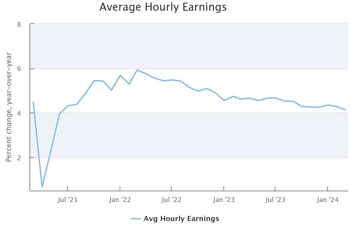 주간 노동시간은 34.4시간으로 0.1시간 늘었습니다. 다행인 것은 모든 데이터가 예상보다 좋았는데, 시간당 임금 상승률은 전월 대비 0.3%, 전년 대비 4.1%로 예상에 부합했다는 것입니다. 4.1%는 2021년 6월 이후 거의 3년 만에 가장 낮은 겁니다.