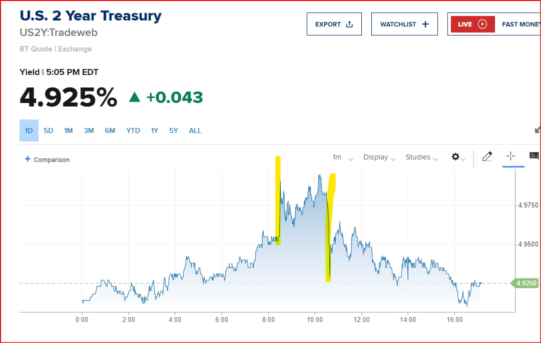 실제 긴장 완화로 상승세를 보이던 금리가 3월 소매판매 발표에 폭등했습니다. 뉴욕 채권시장에서 국채 10년물 수익률은 한때 16bp 넘게 오르면서 4.663%까지 뛰어올랐습니다. 2년물도 10bp 넘게 뛰면서 4.999%까지 상승했습니다. 5%가 저항선으로 작용하지 않았다면 그걸 넘었을 수도 있지요.