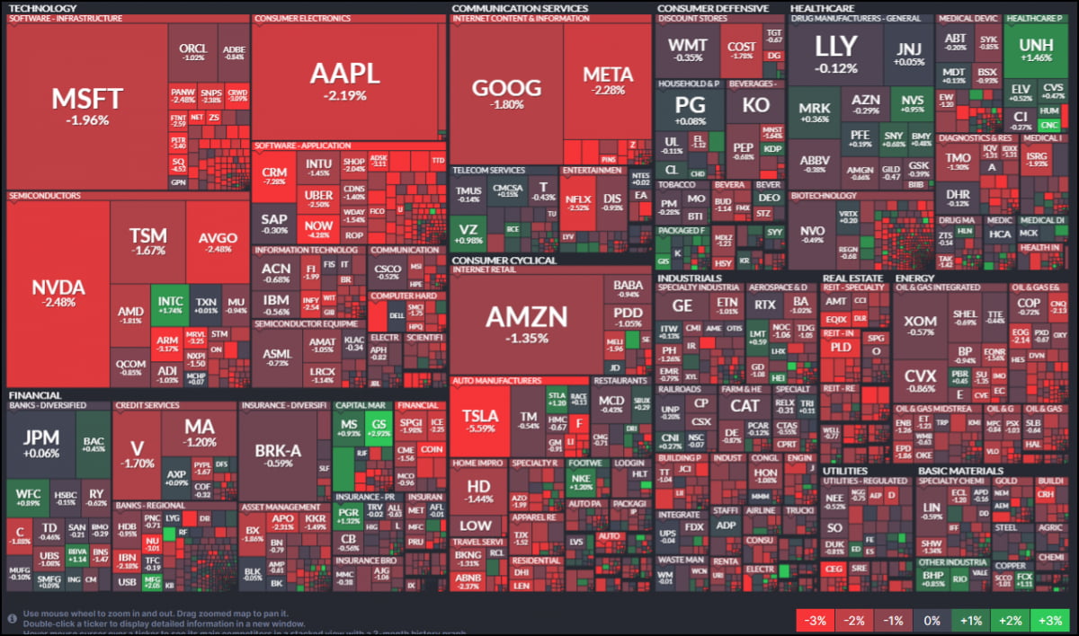 S&P500 지수의 모든 업종이 하락한 가운데 오전에 상승세를 보였던 빅테크도 모두 하락했습니다. 특히 부정적인 뉴스가 터진 애플(-2.19%)과 테슬라(-5.59%)가 직격탄을 맞았습니다.
