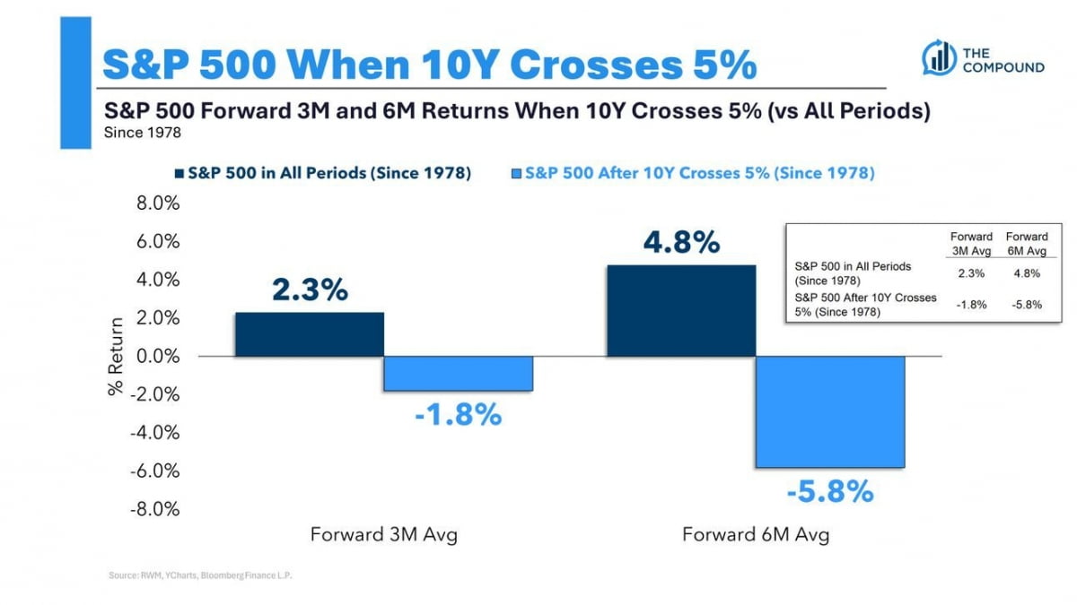 국채 2년물 수익률은 오늘은 하락했지만, 어제 파월 의장 발언 직후 한때 5%를 넘기도 했었습니다. 에버코어 ISI는 "작년 9~10월 국채 2년물 수익률이 5%를 넘었을 때는 주식 시장에서는 매도세가 촉발됐었다"라면서 "S&P500 지수는 2분기에 4600 후반에 걸쳐 있는 200일 이동평균선(DMA)을 시험하게 될 것으로 예상하며, 이는 경기 침체가 없었던 해의 평균 최대 하락 폭인 -13%와 일치한다"라고 주장했습니다.