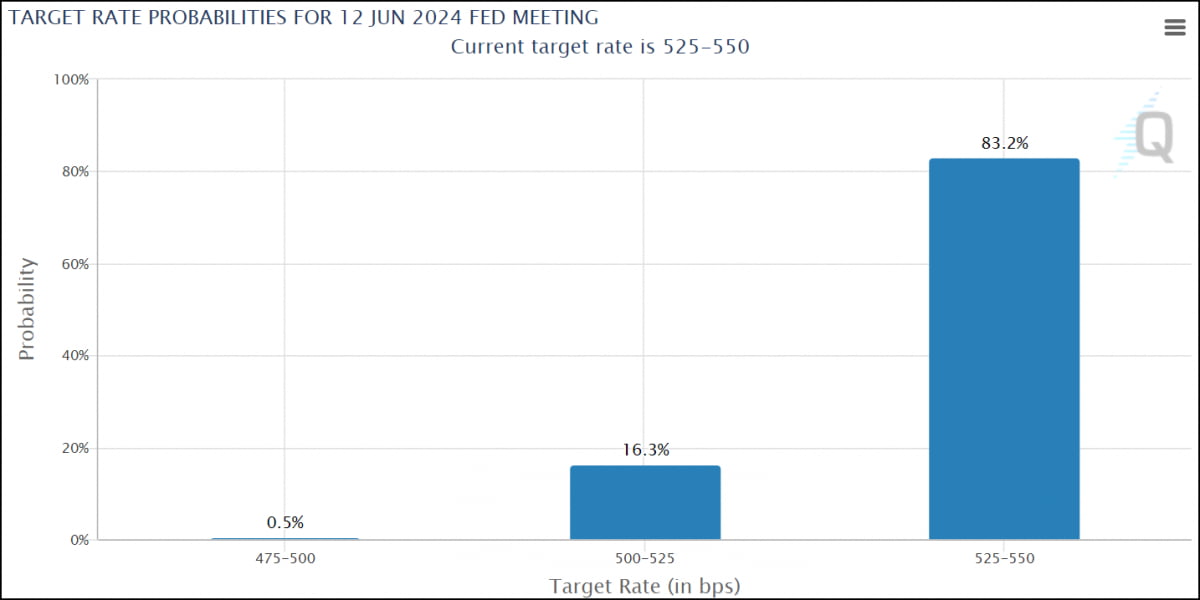 이런 논란 속에 금리 인하 기대는 뒤로 밀리고 있습니다. 하지만 이미 많이 후퇴한 상황이어서 파월 발언 전과 후에 크게 변화한 것은 아닙니다. 시카고상품거래소 Fed 워치 시장에서의 6월 금리 인하에 대한 베팅은 월요일 20%에서 17%로 떨어졌지요. 이미 파월 발언 전에 시장에 대부분 반영됐었다는 것이죠.