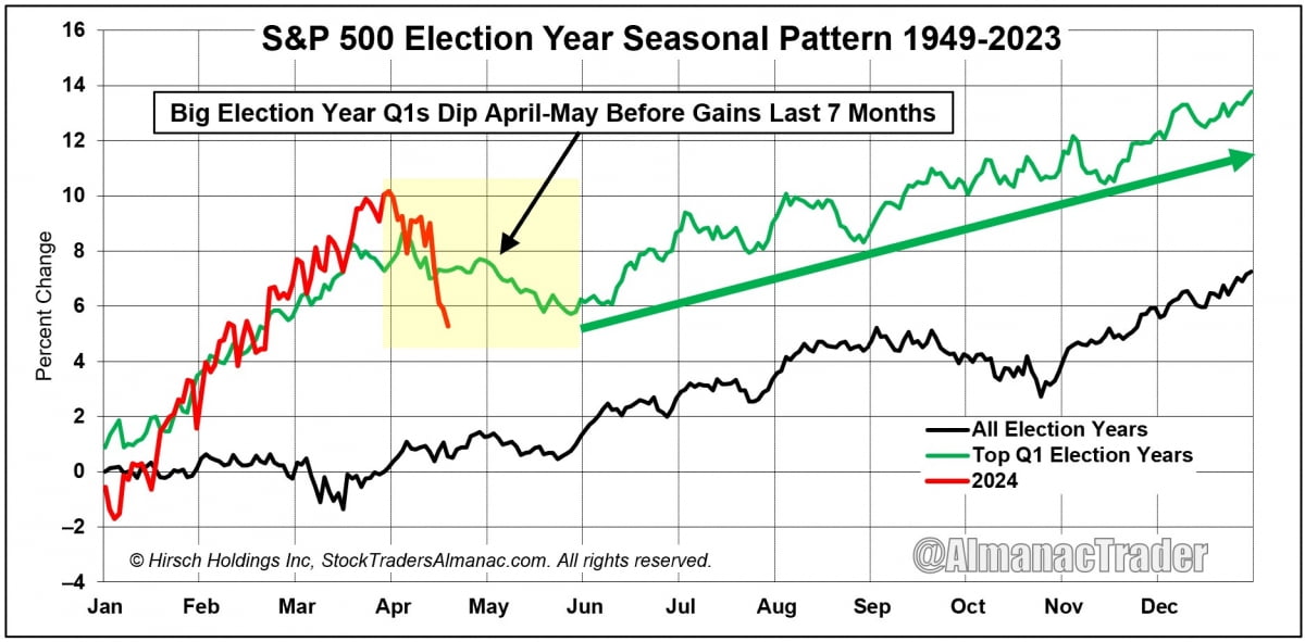 알마냑 트레이더의 제프리 히치 히치홀딩스 CEO는 "대선 연도에 1분기 큰 폭으로 오른 뒤에는 4~5월 하락세를 보인 다음 이후 7개월간 상승세를 보였다"라고 설명했습니다.
