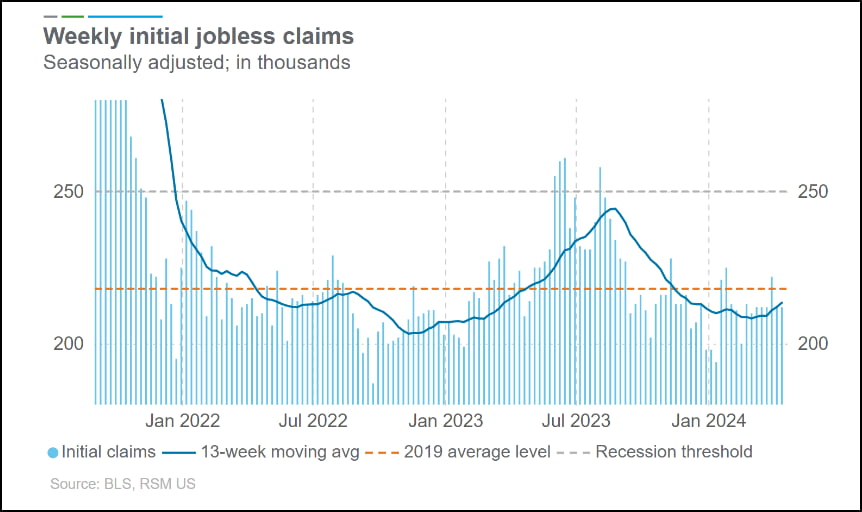 주간(~13일) 신규 실업급여 청구 건수는 21만2000건으로 이전 주와 같았습니다. 연속으로 실업급여를 청구한 수는 2000건 증가한 181만2000건으로 집계됐습니다. 더블라인 캐피털은 "실업급여 청구 데이터는 상대적으로 견고한 노동 시장을 나타낸다"라고 밝혔습니다.