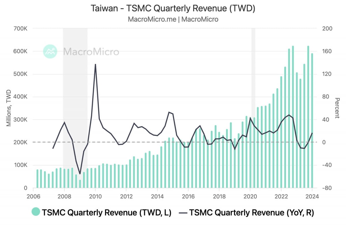 18일(미 동부시간) 새벽 발표된 TSMC의 실적은 예상보다 좋았습니다. 1분기 순이익이 지난해 같은 기간보다 8.9% 증가했고, 매출도 16.5% 늘었습니다. 이런 실적 호조는 기본적으로 AI 수요 덕분이었습니다. 웨이저자 CEO는 "AI 분야에서 칩 수요가 만족시키기 힘든 수준까지 급증하고 있다. AI 데이터센터에 대한 수요가 매우 강하다. 생산 역량을 늘리기 위해 최선을 다할 것"이라고 밝혔습니다. 그는 "올해 AI 관련 칩이 전체 매출의 10% 이상을 차지할 것이며, 2028년에는 20%대로 증가할 것"이라고 전망했습니다.
