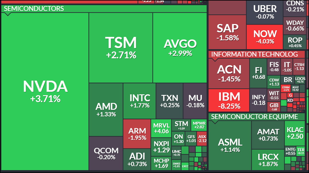 메타의 실적 발표는 엔비디아 등 반도체 업체엔 호재였습니다. 엔비디아는 3.71% 뛰었고 AMD는 1.33%, TSMC 2.71%, 브로드컴 2.99% 등 급등세를 보였습니다. JP모건의 트레이딩 데스크는 "메타의 주가 폭락은 알파벳 스냅 등 디지털 광고에 의존하는 기업에 부정적이다. 하지만 막대한 AI 지출은 엔비디아 슈퍼마이크로 등 반도체/하드웨어 회사에 긍정적"이라고 밝혔습니다.