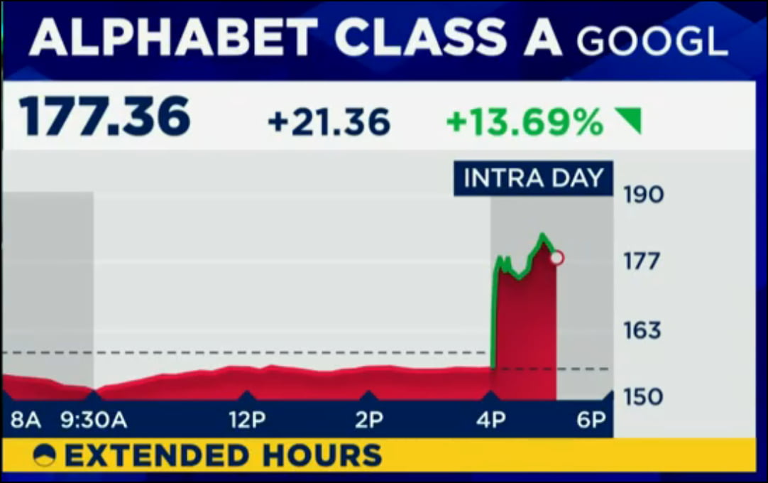 알파벳은 이런 실적을 기반으로 사상 처음 주당 20센트의 배당금을 지급하고 700억 달러 규모의 주식을 사들이겠다고 밝혔습니다. 시간 외 거래에서 주가는 10% 넘게 뛰고 있습니다.