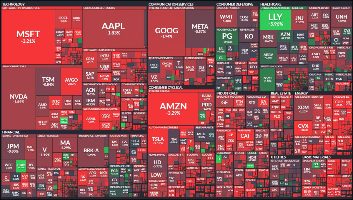 뉴욕 증시의 주요 지수는 0.1~0.3% 수준의 소폭 하락세로 출발했습니다. 하지만 오전 10시 40분을 넘어서자 내림세가 가팔라졌습니다. ECI로 인해 내일 FOMC 결과에 대한 두려움이 커졌을 수 있습니다. 냇얼라이언스 증권의 앤드루 브레너 전략가는 "시장은 내일 Fed의 발표를 앞두고 완전히 두려움에 떨고 있다. 가까운 미래에 금리는 하락하지 않을 것이며 주식은 높은 가격을 정당화하는 데 어려움을 겪고 있다"라고 말했습니다.