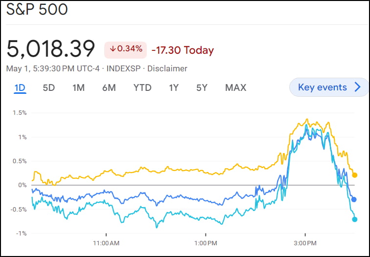 1일(미 동부시간) 오후 2시 연방공개시장위원회(FOMC) 회의 결과는 예상과 같았습니다. 기준금리는 유지됐고 정책 성명서엔 양적 긴축(QT) 속도를 낮춘다는 내용이 포함됐습니다. 이어진 제롬 파월 의장의 기자회견은 예상대로 매파적이었습니다. 하지만 지난 4월 16일 했던 "더 오랫동안 지금 정책(금리)을 유지하겠다"라는 발언을 반복하는 정도였습니다. 월가가 두려워한 '금리 인상' 가능성에 대해선 "그럴 것 같지 않다"라고 잘랐습니다. 걱정했던 것보다는 비둘기파적이었죠. 투자자들은 안도했습니다. 하지만 우려했던 것보다 완화적이었을 뿐이지, "높은 금리를 더 오래 유지하겠다"는 건 기본적으로 매파적입니다. 장 막판 시장은 흔들리면서 혼조세로 거래를 마쳤습니다.