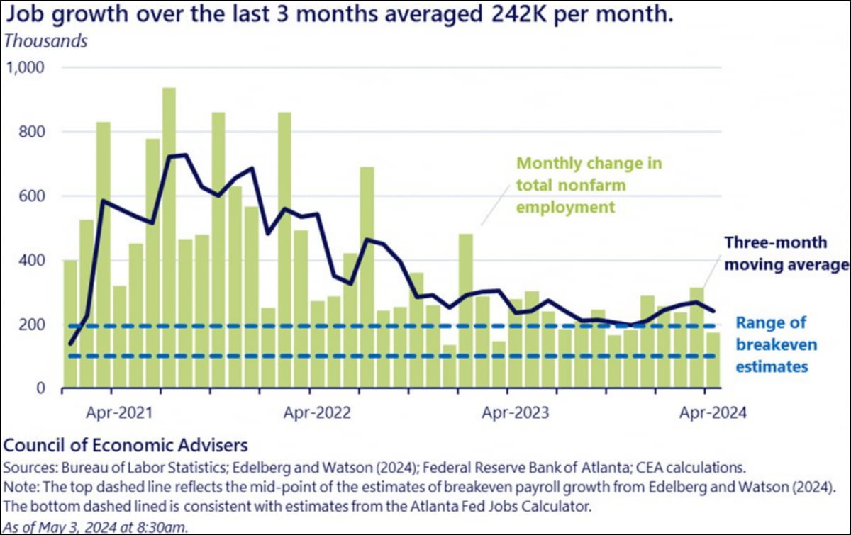 ▶에버코어 ISI는 "4월 고용보고서는 제롬 파월 의장이 지난 연방공개시장위원회(FOMC)에서 매우 매파적으로 행동하지 않은 데 대한 타당성을 입증하며, 금리가 충분히 제약적이라는 확신을 제공한다. 그러나 노동시장의 약세는 Fed가 금리를 인하할 정도로 심각하지는 않다. Fed와 시장에 좋은 소식이다. 우리는 Fed가 올해 9월부터 두 차례 인하할 것이란 우리 가정에 조금 더 자신이 생겼다. 7월에 내리려면 인플레이션이 더 빠르게 하락하는 등 많은 일이 빨리 잘 진행되어야 한다"라고 밝혔습니다.