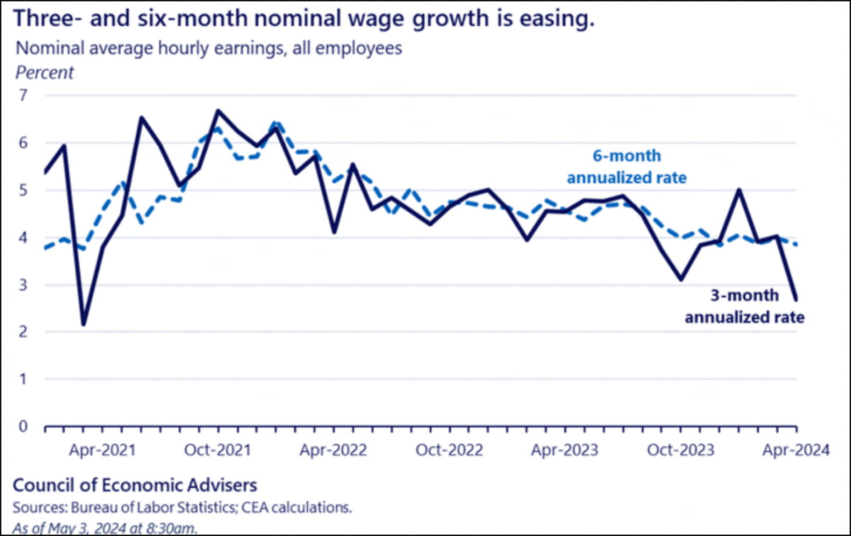 ▶르네상스 매크로는 "연착륙 강세론자들은 이 보고서를 반기고 있다. 시간당 평균 임금은 지난 3개월 평균으로 월 2.8% 증가했다. 노동생산성의 향상 속도를 고려할 때 이런 데이터는 미 중앙은행(Fed)의 장기적인 인플레이션 목표 2%에 부합한다"라고 설명했습니다.