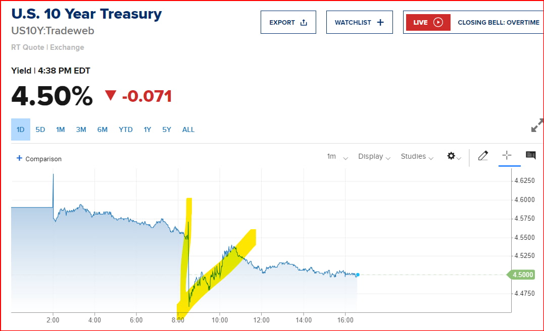 뉴욕 채권 시장에서는 고용보고서 발표 직후 금리가 10bp 이상 급락했습니다. 국채 2년물 수익률은 한때 16bp 하락한 4.716%까지 내렸습니다. 10년물도 11bp 이상 내린 4.453%까지 하락하기도 했습니다.