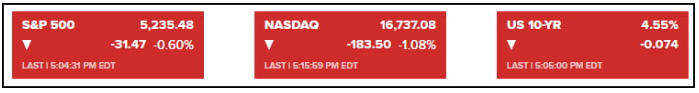 오전 9시 30분 뉴욕 증시가 개장할 무렵, 10년물 수익률은 어제보다 6bp 내린 4.564%에 거래되고 있었습니다. 투자자에겐 안도감을 주는 일이었죠. 하지만 뉴욕 증시는 반등하지 못했습니다. S&P500 지수와 나스닥 지수는 0.2% 수준의 하락세로 출발했지만, 다우는 0.9% 큰 폭 내림세로 거래를 시작했습니다. 다우 30종목 중 하나인 세일스포스가 개장과 함께 17% 넘는 폭락세를 보인 탓입니다.