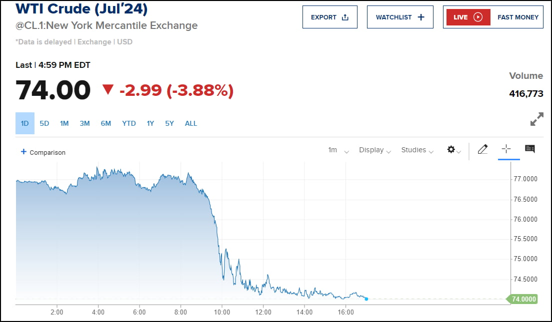 유가는 폭락세를 보였습니다. 7월 인도 서부텍사스산 원유(WTI)는 3.60% 하락한 배럴당 74.22달러에 거래를 마쳤습니다. 지난 2월 7일 이후 넉 달 만에 가장 낮은 수준입니다. 브렌트유도 3.4% 하락한 배럴당 78.36달러에 거래됐습니다. 역시 지난 2월 5일 이후 최저가입니다.