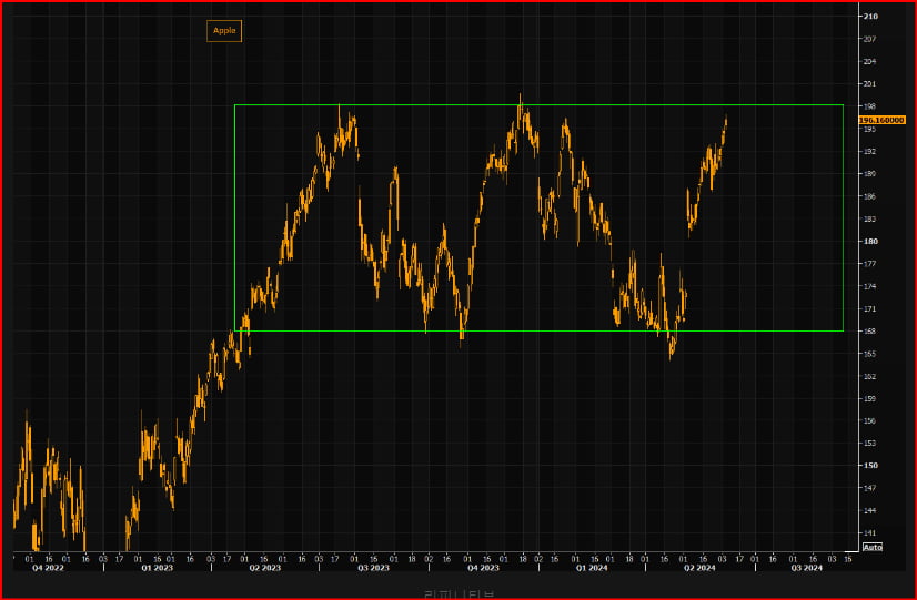 애플의 주가는 작년 2분기부터 168~198달러 사이에서 머물러 왔습니다. 오늘 주가는 194달러로 그 박스권의 최상단까지 다시 올라왔습니다. WWDC는 애플 주가가 1년간 형성된 박스권을 깨고 올라가는 계기가 될 수 있을까요?