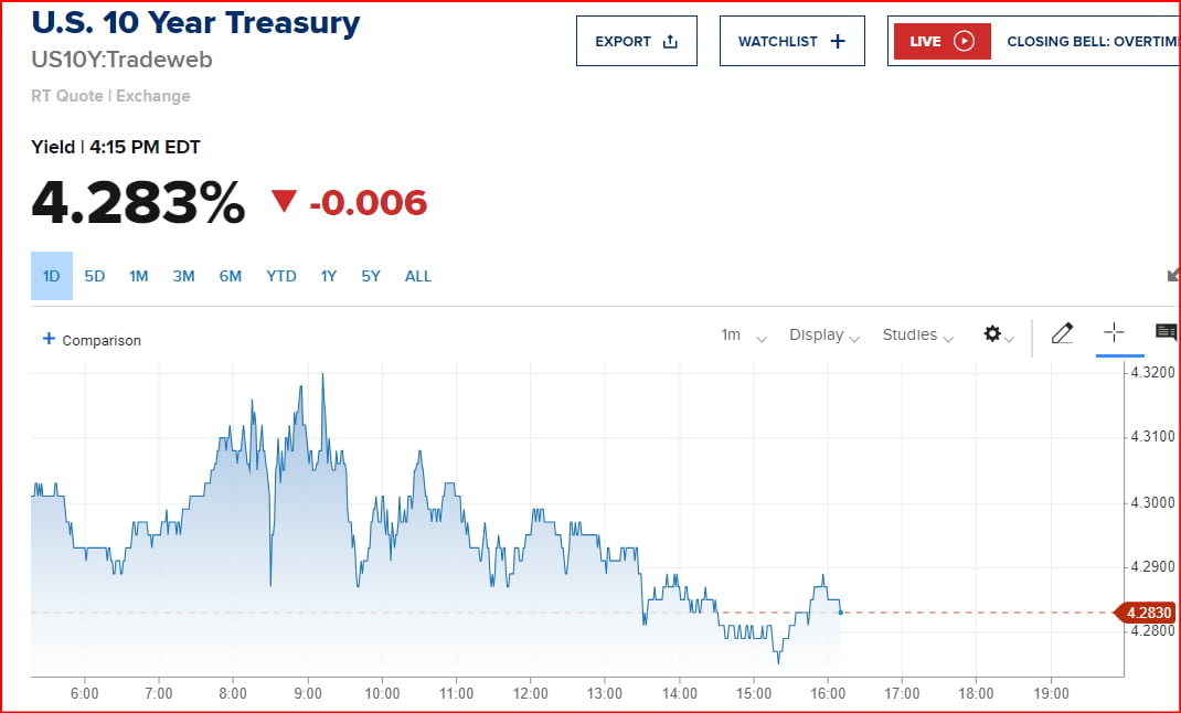 아침에 소폭 상승세를 보이던 뉴욕 채권시장의 금리는 데이터가 나온 뒤 약보합세를 보였습니다. 오후 4시 15분께 미 국채 10년물 수익률은 0.6bp 내린 4.283%, 2년물은 0.5bp 하락한 4.726%에 거래됐습니다.