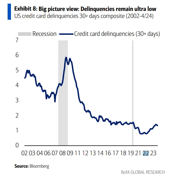 서브라매니언은 경제를 나쁘게 볼 이유가 없다고도 밝혔습니다. 최근 신용카드 연체가 증가하고 있다는 분석들이 있었는데요. 그는 "곰들은 망원경의 반대쪽 끝을 보고 있다. 최근 부드러운 경제 데이터가 경고의 원인이라고 주장하는데 이건 매우 근시안적이다. 멀리 떨어져서 보면 신용카드 연체 추세는 정상화되고 있으며, 장기 추세에 비춰보면 건전하다"라고 주장했습니다.