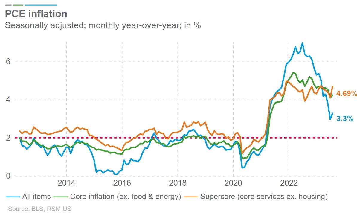 그는 "경제가 약해지지 않는 한 인플레이션을 2% 목표까지 낮추기에는 충분하지 않은 것처럼 보인다. 인플레이션은 계속 하락하기보다는 현재 비율로 안정될 가능성이 더 크다. 이로 인해 Fed는 계속 긴축하게 될 것이며, 잠시 멈췄다가 다시 금리를 인상하거나 높은 수준에서 금리를 유지하는 형태를 보일 수 있다. 이는 위험자산을 취약하게 만들 것"이라고 주장했습니다.