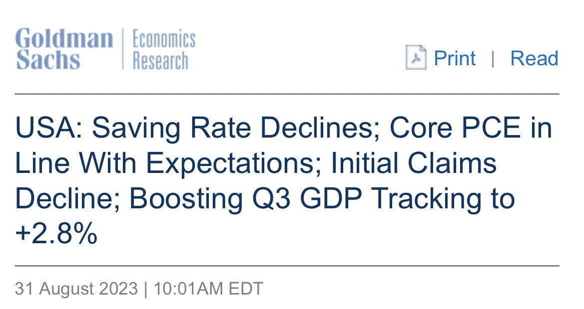 실제 골드만삭스는 "7월 개인소비지출이 예상했던 것보다 더 많았다"라며 3분기 미국의 국내총생산(GDP) 증가율 추정치를 기존 2.1%에서 2.8%로 크게 높였습니다.