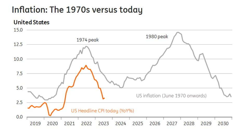 ING는 '인플레이션이 1970년대 재방송을 앞두고 있나'라는 보고서를 내놓고 "인플레이션이 몇 달 동안 둔화하는 가운데 '제2의 물결' 가능성을 둘러싼 논쟁이 진행 중이지만 과거는 미래를 가늠하는 완벽한 척도가 아니다. 이는 대체로 난센스"라고 주장했습니다.