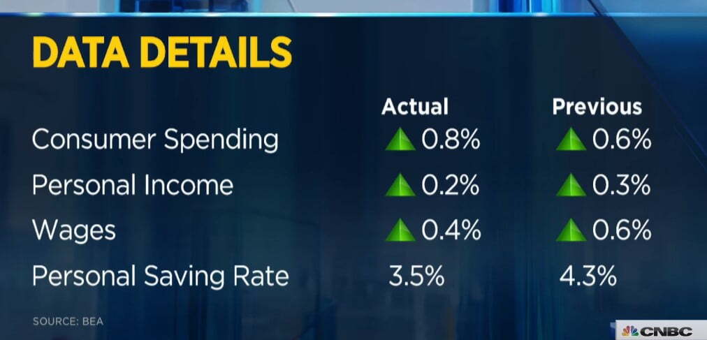 그런데도 소비자들이 7월 지출을 0.8%나 늘릴 수 있었던 것은 바로 저축 덕분이었습니다. 저축률은 7월에 8개월 만에 최저치인 3.5%로 떨어졌습니다. 6월에는 4.3%였습니다.