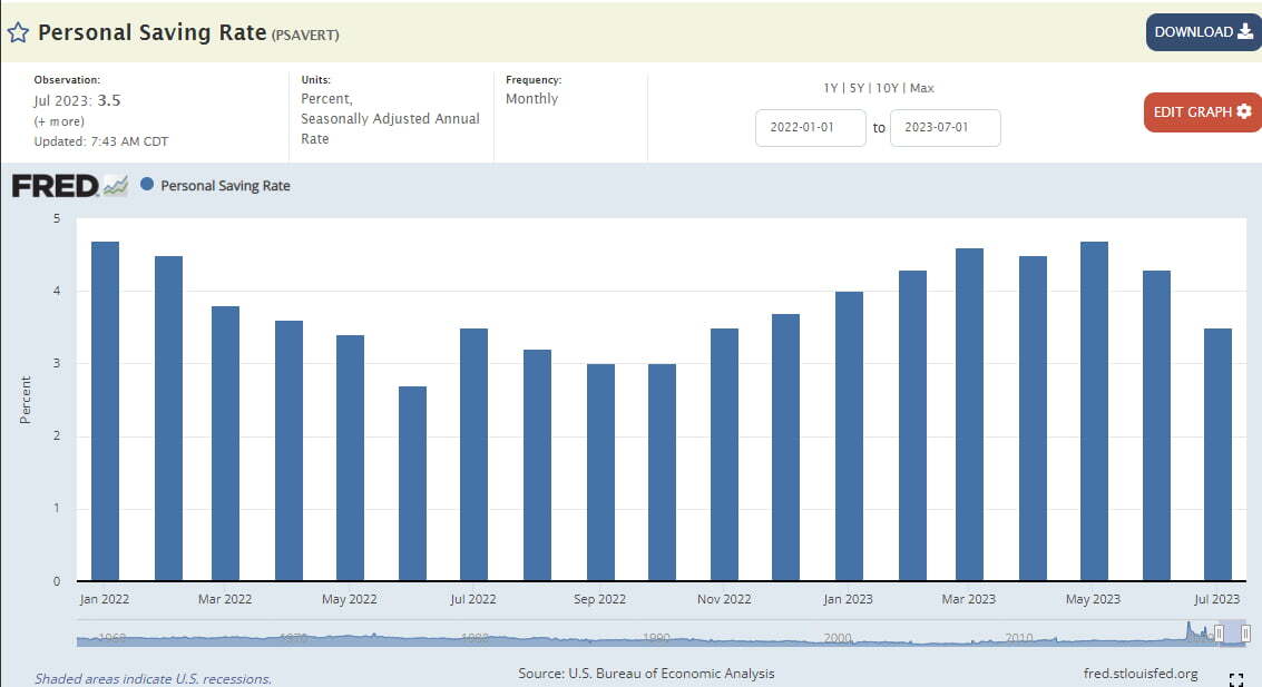 ING는 "소비 지출은 아마도 3~3.5%의 3분기 GDP 성장률을 견인할 것으로 예상된다. 하지만 이는 지속 가능하지 않다. 소비자들은 저축을 줄이고 신용 카드를 써서 소비의 많은 부분을 조달하고 있다. 재무 스트레스가 더 뚜렷해지고 학자금 대출 상환이 10월 재개되면서 소비자 지출은 4분기 말부터 의미 있게 둔화하고 2024년 초에는 마이너스로 전환될 것으로 예상한다"라고 밝혔습니다.